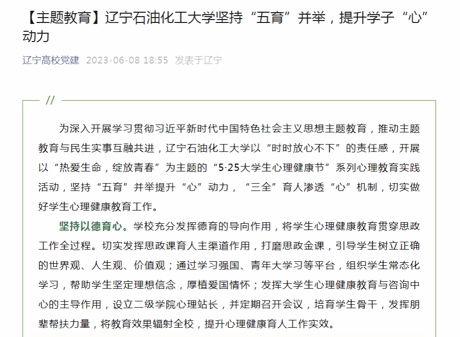 编者按:6月8日,辽宁高校党建微信公众号对我校深入开展学习贯彻习近平新时代中国特色社会主义思想主题教育,推动主题教育与民生实事互融共进,开展以“热爱生命,绽放青春”为主题的“5·25大学生心理健康节”系列心理教育实践活动,坚持“五育”并举提升“心”动力,“三全”育人渗透“心”机制,切实做好学生心理健康教育工作进行了宣传报道。现将相关报道转载如下: