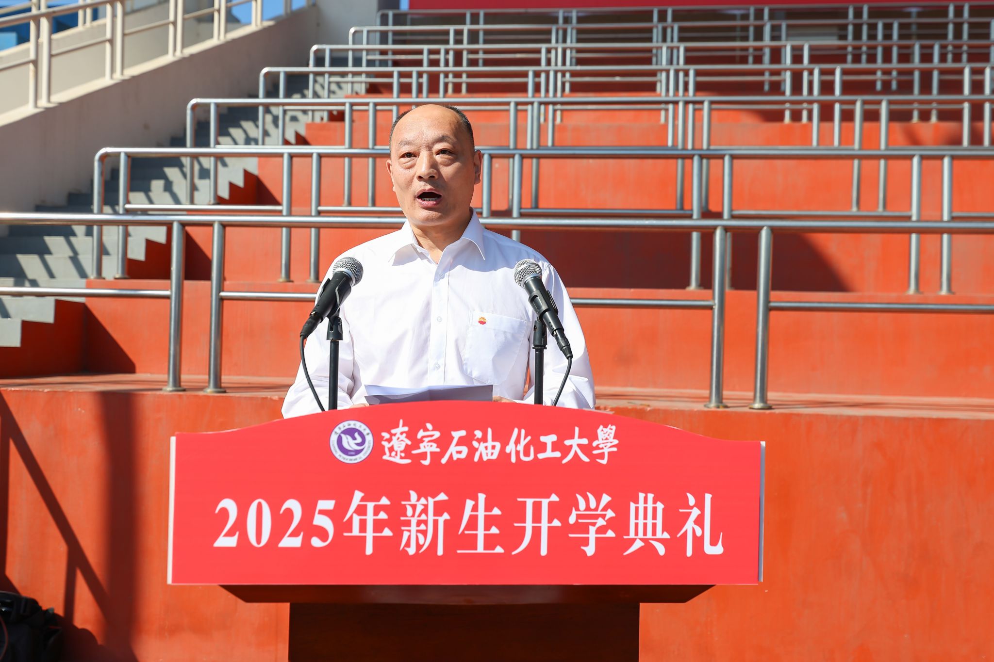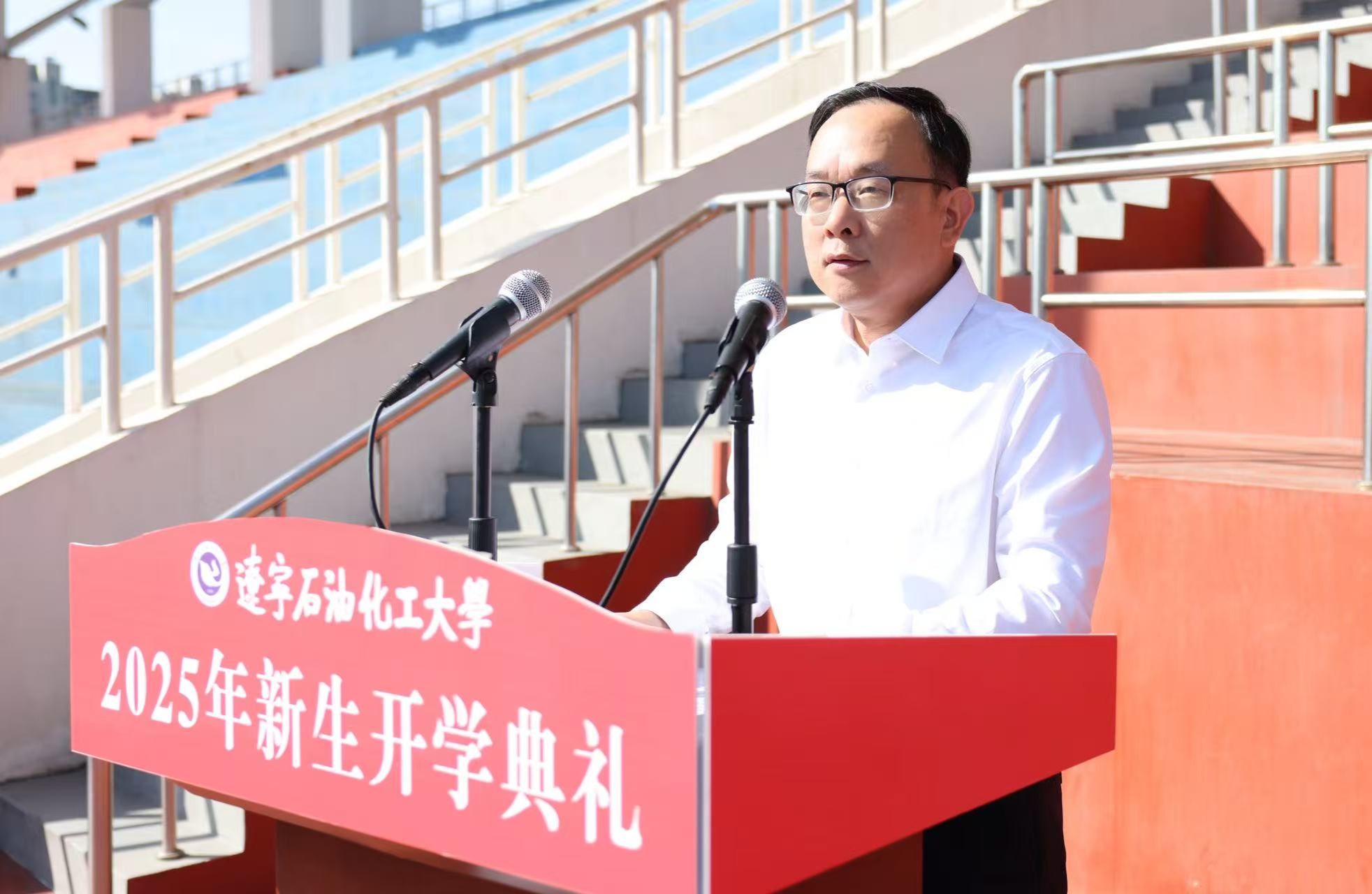新秋执笔,共绘新程。9月15日上午,学校2025年新生开学典礼在东体育场举行,2025级研究生、本科生和预科生新同学齐聚东体育场,青春蓬勃气息满场涌动。校党委书记霍庆生,校长刘坚,校纪委书记房贵新,副校长刘海峰、王强,杰出校友代表、中国石油辽阳石化分公司党委副书记张洪滨,各职能部门负责人、各学院党政主要负责人、教师代表和全体新生等出席典礼。王强主持典礼。